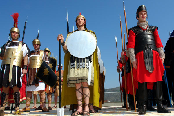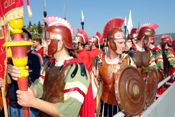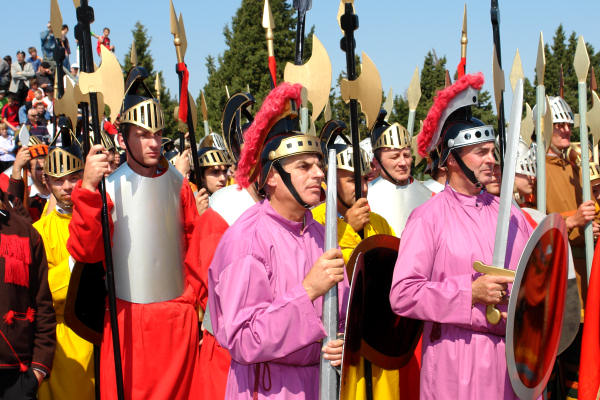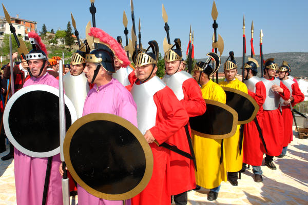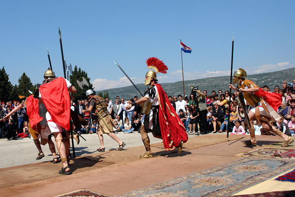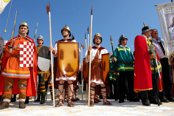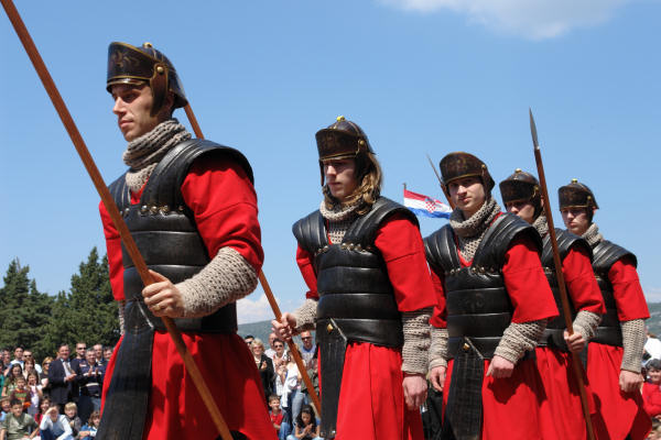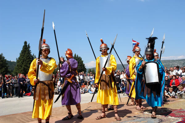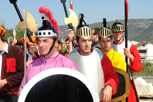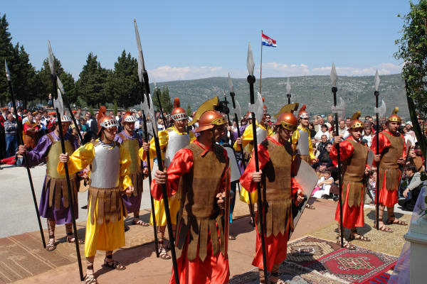 Šarenilo odora i povijesnih razdoblja Prvi put na Smotri - lijevo Imoćani, u sredini Kninjani, desno Varešani Kamen iz Augusteja u Naroni opet se osjeća „kao kod kuće“