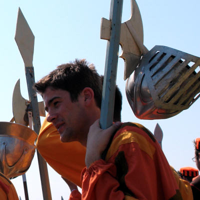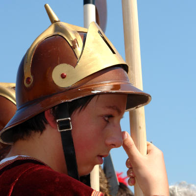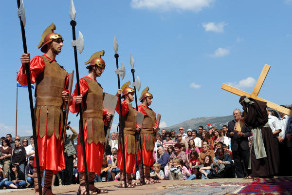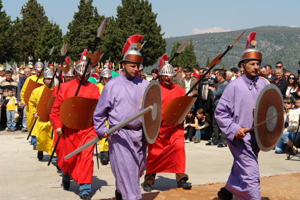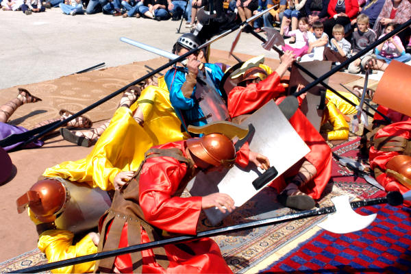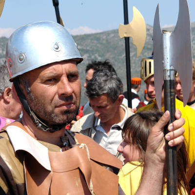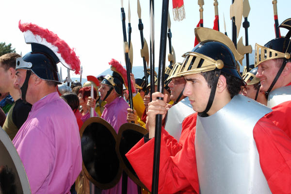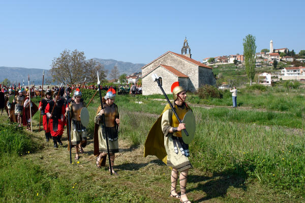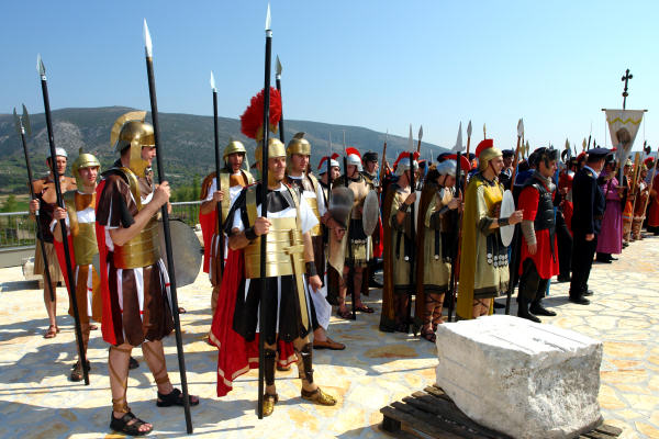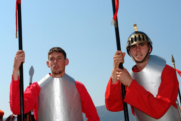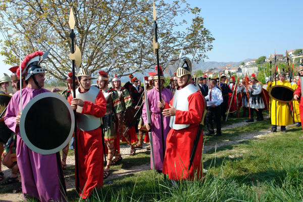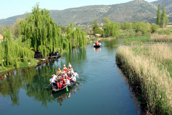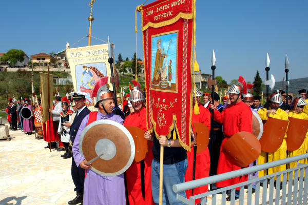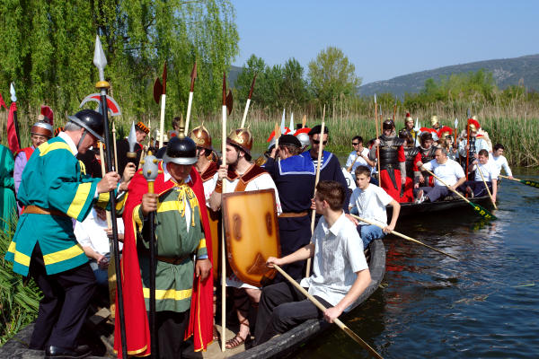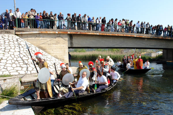 Plovidba Norinom Iskrcaj na rivi u Vidu Postrojavanje na krovu Muzeja Narone. U prvome planu žudije župe Sv. Nikole Metković