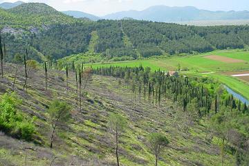 U drugom planu, geometrijski ružno-pravilni, usjeci u borovoj šumi samo nas podsjećaju na vrijeme u kojem živimo. U našem binarnom svijetu koji sve se više sastoji od logičkih nula i jedinica nemamo izbora. Ili usjeci ili ono što vidimo u prvom planu. Tužno povaljani trupci borova nakon požara koji je u ljeto 2000., došavši s one strane granice, spalio obronke Šibanice. Na svu sreću mnogi su pravi Metkovci, i oni koji se tako osjećaju, tih jezovitih noći spremno pošli  među zapaljena stabla. A o Nerončićima, koji su taj stravično veličanstven prizor promatrali ispred kafića u Sportskoj, ne treba trošiti riječi. Oni hodaju maleni ispod zvijezda.