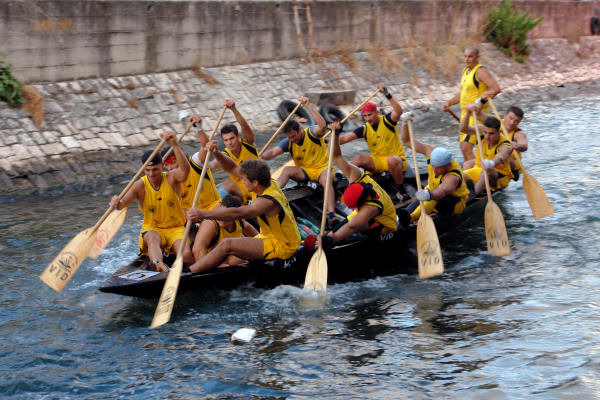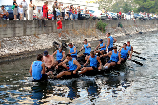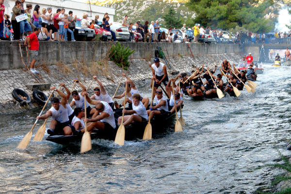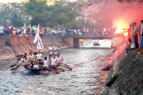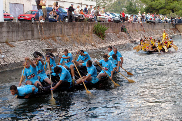 Sjedamo u automobil i upućujemo se na desnu stranu Neretve smatrajući da će na cesti prema Kuli Norinskoj biti manja gužva. Vrlo brzo zaključujemo da je i tamo krkljanac. Milimo do Kule i tamo jedva uspijevamo dostići dva broda s gostima grada Metkovića koji su plovili na začelju. Prve lađe već su prošle Krvavac. Kako je županijska cesta kroz Krvavac preko Opuzena i Komina uska, u Kuli skrećemo preko Bagalovića na Desne te na Banji ponovno izlazimo na nju. Na mostu je, preko kanala koji spaja Neretvu i Crnu rijeku, mnoštvo ljudi koji žele vidjeti koja će posada prva proći ispod tumbina. Nema mjesta za parkiranje pa produžujemo do Rogotina. Tamo ista stvar. Produžujemo prema Pločama gdje zatječemo kompletnu glavnu ulicu pretvorenu u štekat što se nastavlja sve do crkve. Mami nas miris roštilja. Ništa riba i vino, samo ćevapčići, pljeskavice i pivo. Bujrum! Na rivi je masa svijeta što iščekuje Rogotinjane i Kominjane koji se, kako saznajemo putem radija, bore za prvo mjesto. Takav poredak je i ostao do samoga kraja, možda iznenađenje, budući da su Kominjane svi držali favoritima, no, Rogotinjani su, očito, pustili da se protivnik ispuše i znalački održali pobjedničku poziciju do cilja. U Pločama je već svejedno je li pobijedio Komin ili Rogotin jer, i jedni i drugi tamo imaju brojne navijače, a teritorijalno spadaju pod grad Ploče ili, kako je kasnije rekao glumac amater prof. Tomislav Zubčić u liku kneza Domagoja, sam Bog zna kojim su sve rodbinskim vezama povezani Rogotin i Komin. Nastaje opća fešta Rogotinjana uz vidno razočaranje Kominjana.