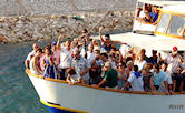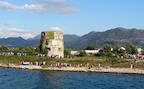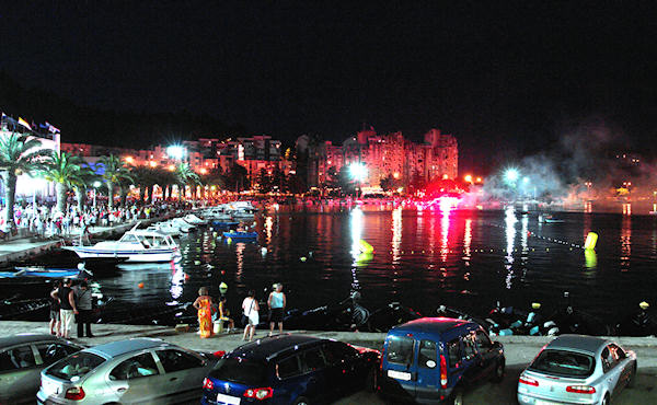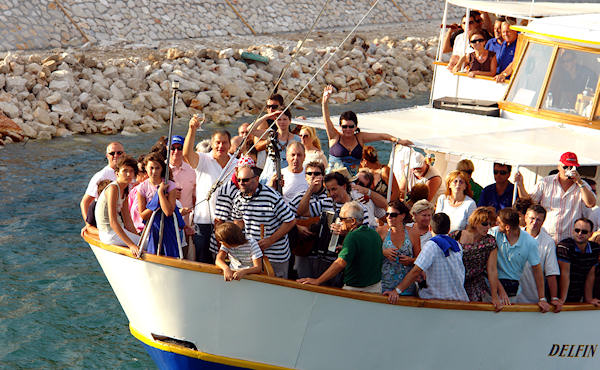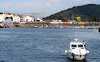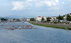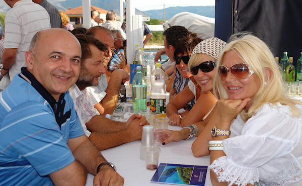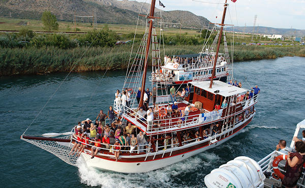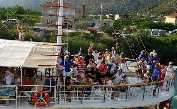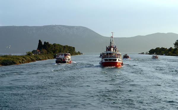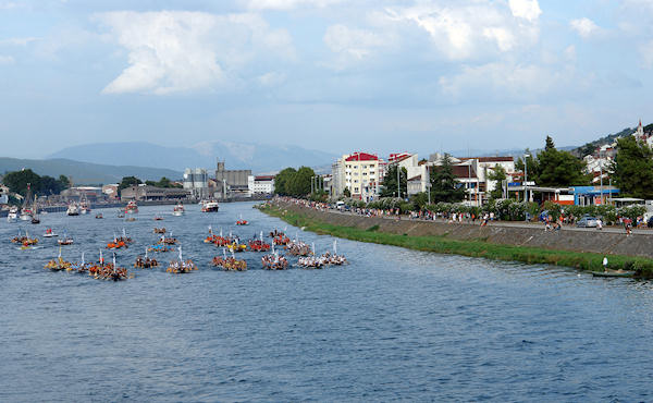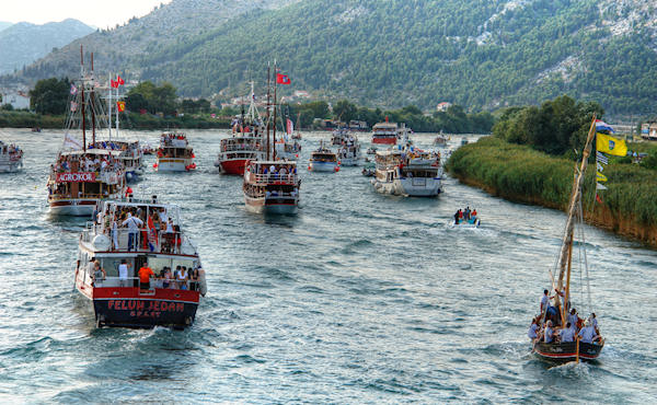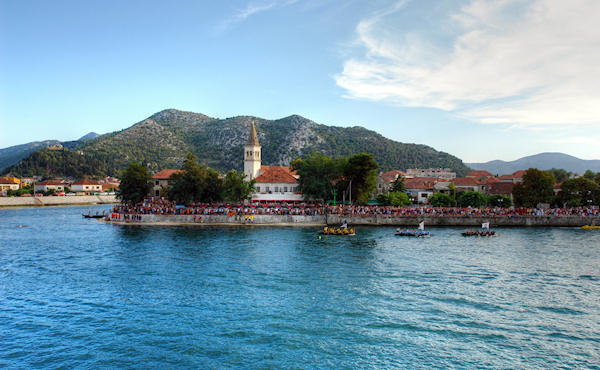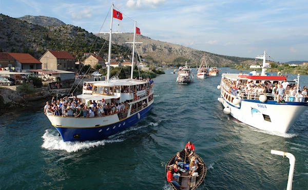 Mnoštvo svijeta na rivi u Opuzenu. Sve lađe moraju proći između rive i plutače.