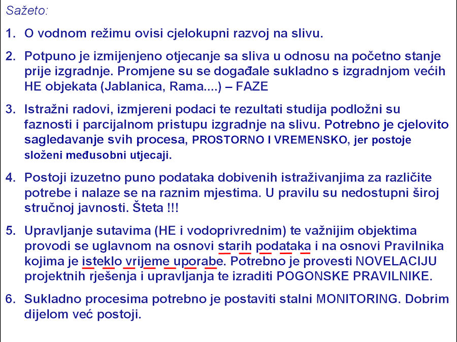 Utjecaji se moraju promatrati u interakciji s već izgrađenim i s planiranim zahvatima“. Upozoreno je i na to da promjene u slivu utječu i na priobalno more.