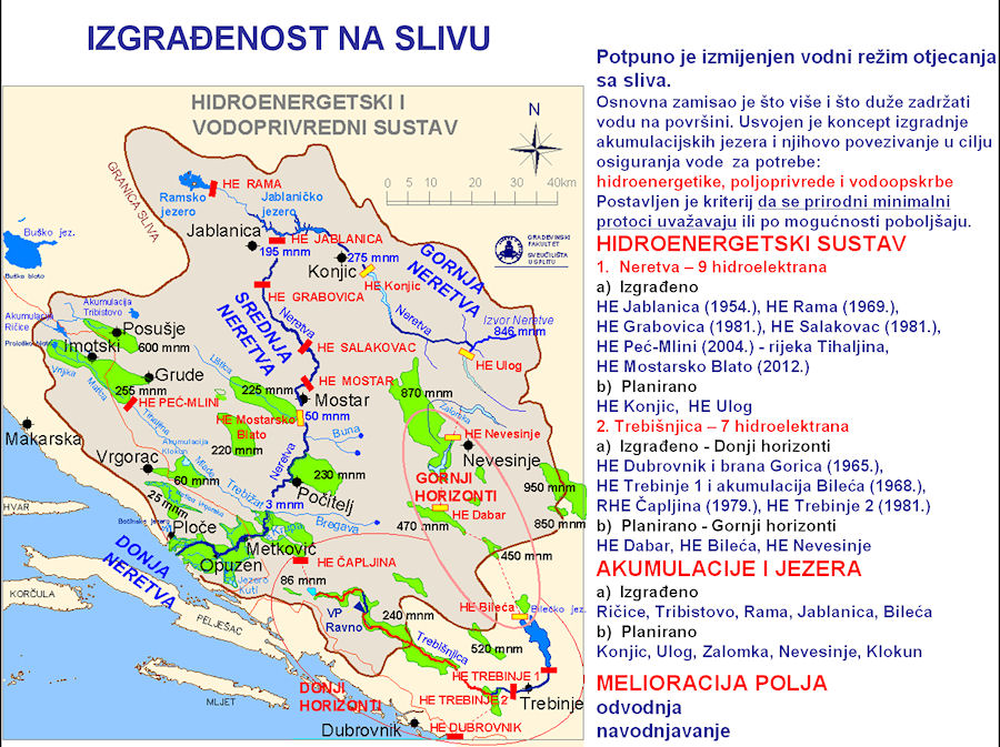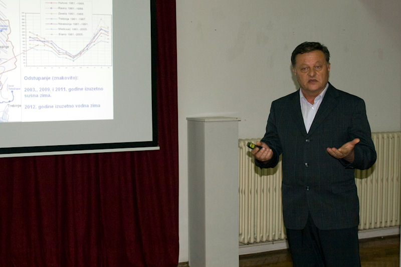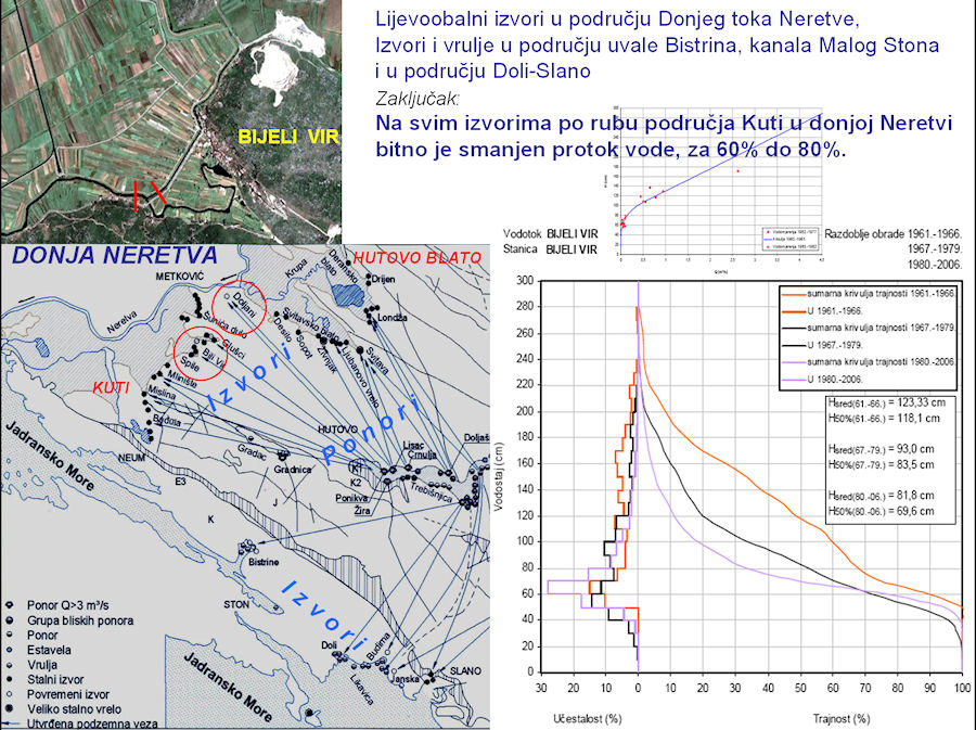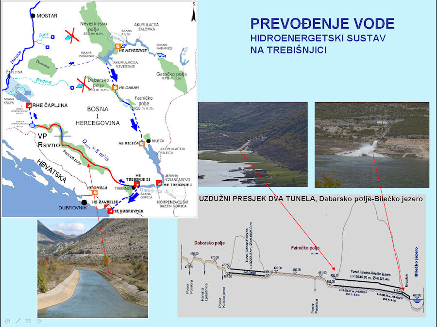 Prof. Vranješ je u uvodnome dijelu svoga predavanja Hidrologija i hidrogeologija sliva Neretve i Trebišnjice, osvrt na izgradnju dijela HE sustava - Gornji horizonti dao pregled slivova Neretve i Trebišnjice te prikazao kako izgledaju podzemni vodotoci, tj. veze između ponora i vodotoka, budući da se radi o krškome terenu. Prema kartama koje je prikazao jasno je da velik dio voda, koji bi na drukčijem reljefu pripadao Trebišnjici, prirodno teče prema Neretvi. Problemi su nastali već prvom fazom izgradnje hidroenergetskoga sustava koji počinje pokraj Gackoga, a završava u Platu kraj Dubrovnika. Prva faza (Donji Horizonti) već je praktički dovršena, dok je druga (Gornji horizonti) dijelom dovršena, a dijelom je pred početkom gradnje, što je ne tako davno izazvalo dosta velike polemike u javnosti. Već prva faza radova – HE Dubrovnik i brana Gorica (1965.), HE Trebinje 1 i akumulacija Bileća (1968.), RHE Čapljina (1979.), i HE Trebinje 2 (1981.) – dovela je do znatnoga smanjenja izdašnosti izvora desnoga zaobalja, pa tako Vranješ navodi da su izvori na području Kuti izgubili od 60 % do 80 % vode, a sigurno je slično i s drugim izvorima na lijevome zaobalju.