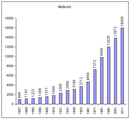 Godine 2001. grad Metković s prigradskim naseljima imao je gotovo 15400 stanovnika, a sam Metković nešto manje od 14 tisuća. Analizirajući demografske promjene od 1981. na ovamo i uvažavajući što se sve dogodilo proteklih devet godina došli smo do podatka da bi dogodine u Metkoviću moglo biti oko 16 tisuća stanovnika, a na području cijeloga Grada nešto manje od 18 tisuća. Pri tome smo u obzir uzimali stanogradnju koja je bujala proteklo desetljeće te pozitivan razvoj situacije u najvećim prigradskim naseljima Vidu i Prudu. Promjene u naseljima Dubravica i Glušci, zbog veličine naselja, ne bi trebale bitno utjecati na ukupne podatke.