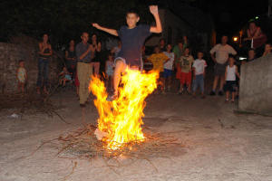 Druženje je nastavljeno na obližnjem Verajinu guvnu na kojem je zapaljena vatra, a prvi skok izveo je najstariji - Ivo Brljević. Slijedili su ga Ivo, Ivica, Ivanka... pa do najmlađih kojima su roditelji malo pomogli u prvim skokovima preko vatre.