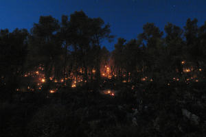 Gasitelje očekuje teška noć jer se izgorjeli borovi još uvijek žare, a vjetar žeravicu raznosi na sve strane.