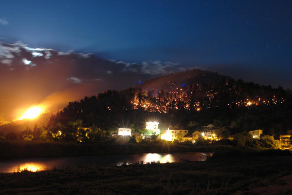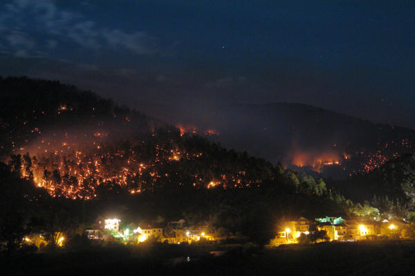 Metković, 1.8.2007. - Iako je veliki požar, koji je nekoliko dana harao područjem Dobranja i Vidonja, jučer uz pomoć kanadera stavljen pod kontrolu, vatra je ponovno, nošena vjetrom, buknula u poslijepodnevnim satima. Najteže je bilo na Mliništu gdje gusta borova šuma seže neposredno do kuća.