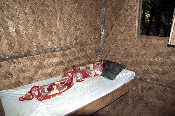 Kuće se uglavnom grade na stupovima, a pod, strop i zidovi su od pletenoga ljuštena pruća. Na isti način građen je i hotel, tako ga tamo barem zovu. Smještaj je bio vrlo skroman, što se vidi i na fotografiji moje hotelske sobe. Poljski WC nema vodu, ali je u blizini tekuća hladna voda iz bambusovih cijevi koja je provedena iz nekoga izvora. Prozor je samo otvor koji se mogao zatvoriti, ali ne i osigurati, a funkciju stakla ima pleteno pruće.