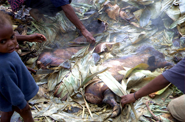 Mladićeva obitelj na svečanost poziva rodbinu i prijatelje. Tradicija zahtijeva ugostiti ih. U tu svrhu kolje se jedna ili više svinja. Način pripravljanja uvijek je tradicionalan. Iskopa se jedna rupa u zemlji; njezini zidovi oblože se vrelim kamenjem, zatim listovima banane, tako da nastaje nešto slično velikome loncu. U taj lonac naslažu se redovi slatkoga krumpira i drugoga lisnatoga povrća, poput listova biljke taro. Zatim se na to stave svinjske polovice, sve se ponovno pokrije bananinim listovima i na kraju dolazi vrelo kamenje. Hrana se tako pari nekih 24-36 sati, a onda se sve izvadi, jede odmah tu rukama, bez posuđa. Svečanosti inicijacije i svadbe rijetki su trenutci kada se u ruralnim područjima Papue Nove Gvineje jede meso. Bogatije ili veće obitelji pripremaju nekoliko takvih lonaca.