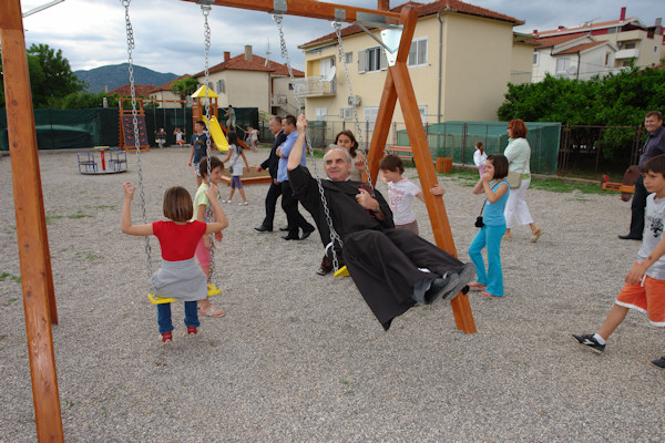 Fra Dušan kao "pokusni pilot" na ljuljački dječjeg igrališta u Ulici Ante Stračevića.