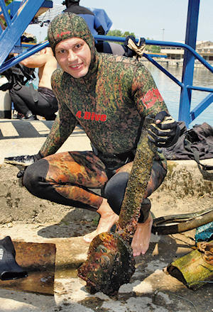 Nikša Kaleb s izronjenim dijelom konstrukcije staroga trolučnoga mosta