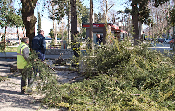 Metković, 4.2.2011. - Dok su metkovski vatrogasci na obali Neretve u Orašini uklanjali veliki jablan koji je rastao preblizu visokonaponskom dalekovodu, na Trgu kralja Tomislava komunalci su ispilili cedar koji je ostao stiješnjen između dvije lipe.