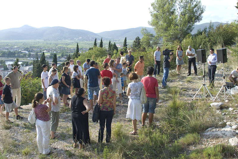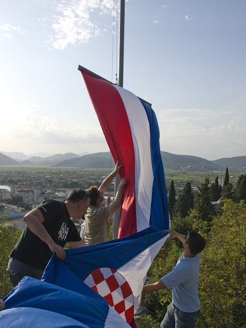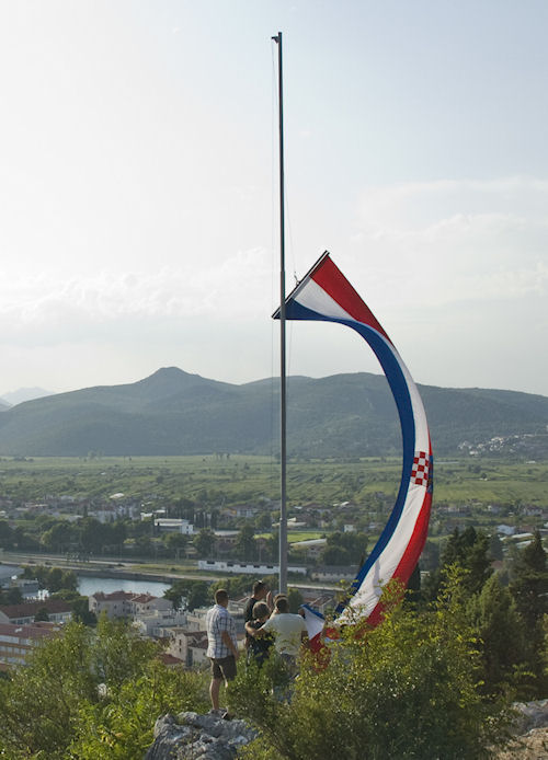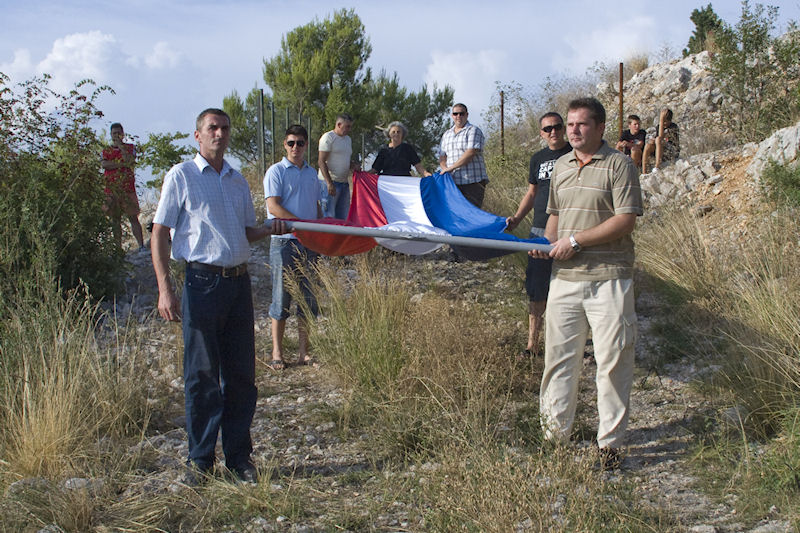 Metković, 4.8.2011. - Predvečer se na Predolcu okupilo pedesetak građana Metkovića kako bi nazočili podizanju replike zastave sa Kninske tvrđave što su organizirale Udruga veterana IV. gardijske brigade, Podružnica za Dubrovačko-neretvansku županiju i metkovska Udruga Narenta.