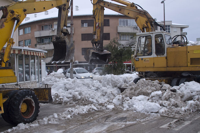 10.2.2012. - Akcija uklanjanja snijega s gradskih ulica nastavljena je sve do u noć, međutim posao sporo ide jer treba s njih odvesti ogromne količine snijega. Više kamiona, čiji teretni prostor prima oko 18 metara prostornih, trebalo je za odvesti snijeg samo s raskrižja A. Stračevića, Matice hrvatske i Kralja Zvonimira.