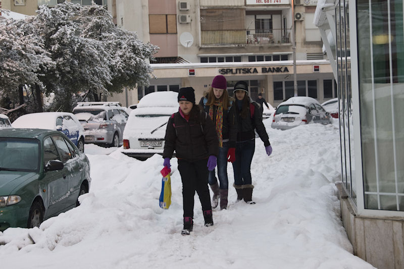 Mi smo u šest već bili vani. Temperatura je bila nešto ispod nule (-1ºC u 7 sati), a glavne prometnice bile su očišćene. Zanimljivo je da je debljina snježnoga pokrivača (tamo gdje je nedirnut) 46 cm. Iako se oko osam sati nebo čini još snježnim, danas bi moglo biti sunca, a noćas opet deblji minus.