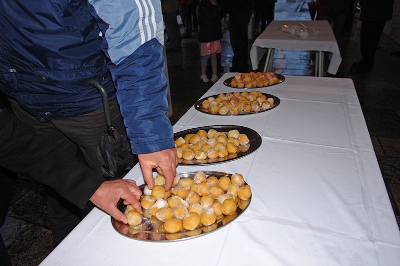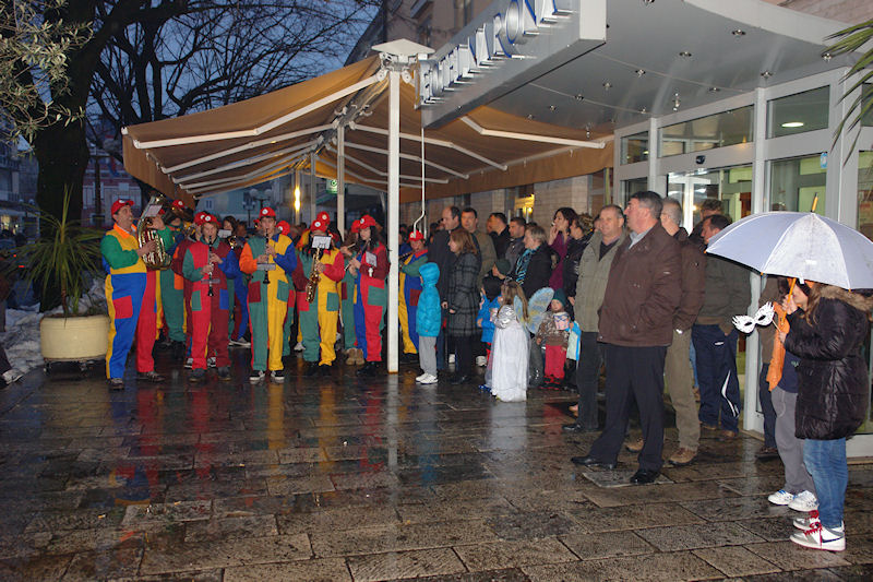 Ipak, unatoč lošem vremenu, na Trgu se okupilo nekoliko stotina građana, među kojima je bilo i maškarane djece. Stvar je donekle spasila velika tenda pred Hotelom Narona pod koju se sklonila Gradska glazba sa svojim instrumentima te mnogi građani s djecom. Promrzlima su se na stolovima nudili tradicionalni uštipci i vino pa je praćenje suđenja bilo lakše. Na ubrzanom procesu Marko je proglašen krivim pa je uz zvuke posmrtnoga marša ispraćen do Velike rive, jer je na Maloj još dosta snijega i poledice, s koje je nakon paljenja gurnut „neka ga Neretva nosi“. Iako je u Hotelu Narona bio pripremljen besplatan grah sa suhim mesom, a Kante je sponzorirao vino, većina se odlučila za bijeg u toplinu doma.