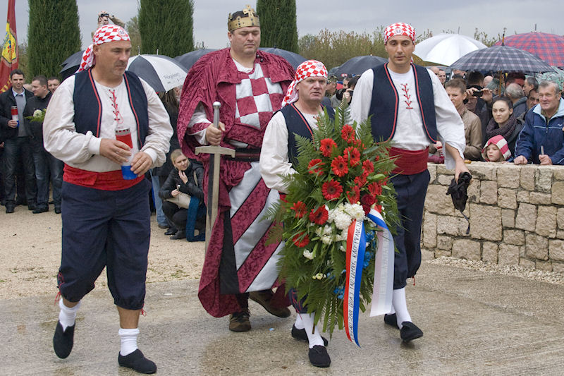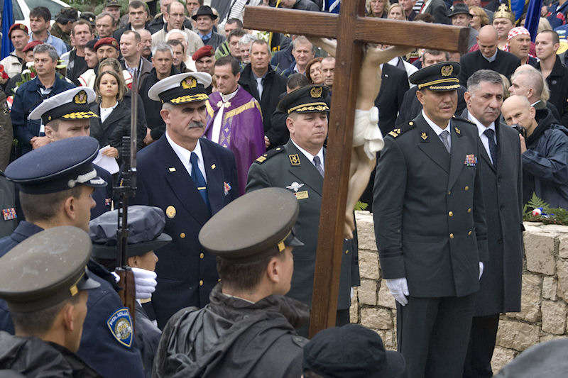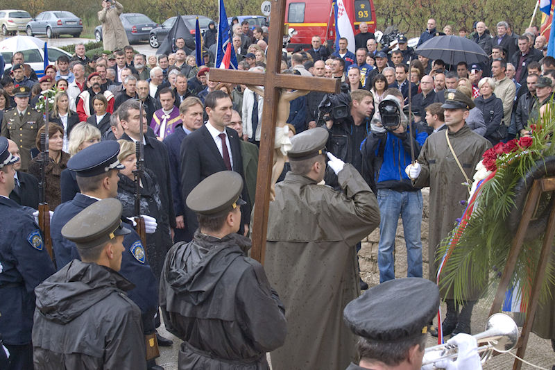 Uz zvonjavu škabrnjskih zvona tužna se kolona uputila do nekoliko kilometara udaljena mjesnoga Groblja sv. Luke na kojemu je veliki križ i ploča s uklesanim imenima svih stradalnika. Prioritet ima protokolarno polaganje vijenaca. Izmjenjuju se svi, od ministra pa nadalje. Tu su i nebrojene udruge, među njima i naši iz Četvrte te lađari.
