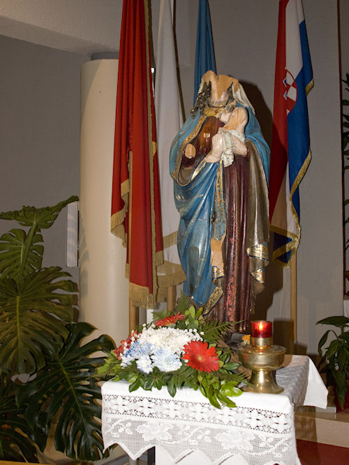 Kolona se vraća prema crkvi u kojoj će zadarski nadbiskup Želimir Puljić predvoditi svetu misu. Crva je ispunjena do zadnjega mjesta pa su mnogi, unatoč kiši, ostali pred njom. Desno od oltara fotografiram naše lađare.