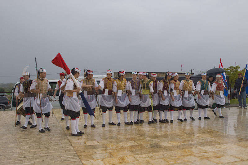 Kiša ne prestaje. Lađari se presvlače u svoje odore, na čemu im ni najmanje ne zavidimo jer nisu baš prilagođene vremenu. Ulazim u crkvu i slikavam drveni kip Majke Božje kako drži Sina. Oboje su bez glave. To je sve što je ostalo iz stare crkve. Za to vrijeme već se priprema mimohod prema masovnoj grobnici usred sela. Inače, obilježja masovnih grobnica u Hrvatskoj svugdje su ista: velika mramorna ploča s prorezom koji izgleda kao golubica, što je znak mira. Baš kao i na Ovčari. U koloni je i ministar Kotromanović. Onako visok, krakat izaziva pozornost. Vijenac pred spomenikom polažu sami Škabrnjani. Ostali se samo poklanjaju mrtvima.