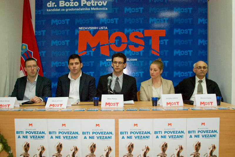 Novinare i druge okupljene za stolom su dočekali članovi Nezavisne liste Most Marin Veraja, Nikola Grmoja, Božo Petrov, kao kandidat za gradonačelnika, Danijela Vidović i Markica Vuica. Uglavnom, iznijeli su svoje viđenje stanja u gradu, detektirali razloge zašto je tomu tako te ponudili neka od rješenja, od kojih ističu mnoge već razrađene projekte kojima mogu u grad donijeti novac iz europskih fondova. Istaknuli su da ne žele kompromise, tj. koaliranje s drugima i najavili potpunu pobjedu na izborima, ali da su nakon toga otvoreni za suradnju sa svakim tko ima kakvu dobru zamisao, bez obzira s koje stane to dolazilo.