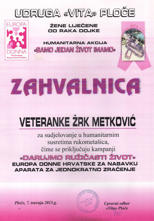 Utakmica je odigrana u okviru humanitarne akcije Samo jedan život imamo koju provodi Udruga Vita iz Ploča. Spomenuta akcija dio je kampanje Darujmo ružičasti život koju je pokrenula Europa Donna Hrvatska, a prikupljenim novcem kupit će se aparat za jednokratno zračenje. Veteranke su za sudjelovanje u spomenutoj humanitarnoj akciji od Udruge Vita dobile zahvalnicu.