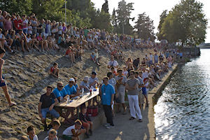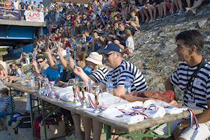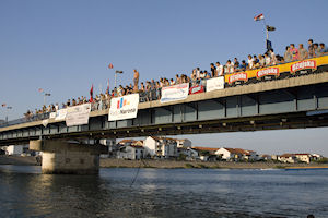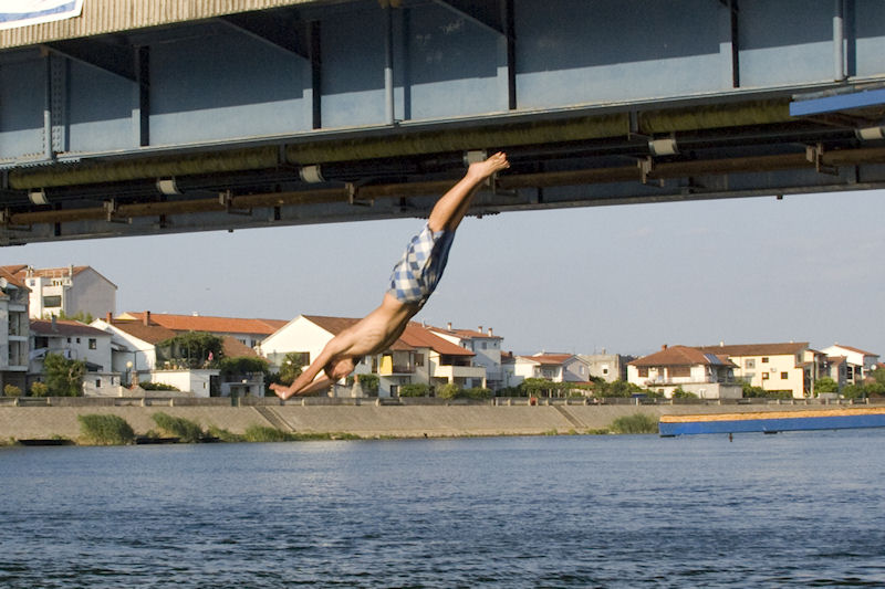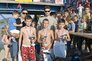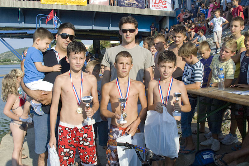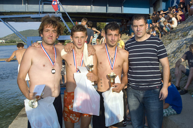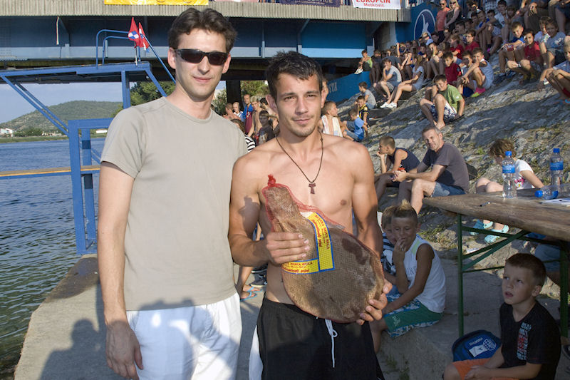 Luka Obradović je za nepunih 29 sekunda uspio doplivati do konopa koji je visio s mosta i uspeti se uza nj. Za to je osvoji pršut, dar firme Kulina.