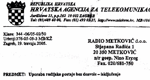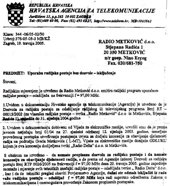 23.4.2005. - Posljednjih dana mnogi su u Metkoviću i okolici zbunjeni kada na lokalnoj frekvenciji od 97 MHz čuju čas signal Radio Metkovića, dosadašnjeg korisnika te frekvenciju, a čas Radija Delta, koji je tu frekvenciju dobio na uporabu na osnovi koncesije dodijeljene 12. siječnja 2005. od Vijeća za elektroničke medije.