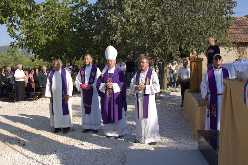Slijedila je sveta misa koju je predvodio splitsko-makarski nadbiskup Marin Barišić, a s njime za oltarom bili su: don Mijo Šurlin, fra Josip Bebić, don Ljubo Pavić, župnici iz Metkovića i Vida don Senko Antunović i don Mladen Margeta te neretvanski svećenici don Darko Jerković i fra Petar Rastočić. Prije svečane euharistije nadbiskup Barišić pozdravio je skup i rekao, između ostaloga – Ovo je sveti trenutak, humanitarni pogled na čovjeka, na žrtvu, dostojanstvo osobe. Tim pogledom potrebno je pogledati i naše tame, neotkrivene stranice skrivene stvarnosti, tajne koje nas obavijaju. Nije pametno kriti svoj grijeh; nije pametno učiniti ga, ali ako smo ga učinili, ne činimo drugu pogrešku nego ga priznajmo. To je veličina čovjeka i to traži dostojanstvo i žrtve i onoga koji je učinio te žrtve.