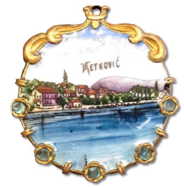 Okrugla emajlirana pločica obrubljena je metalnim ukrasnim okvirom i jedino što se gotovo pouzdano može znati je da potječe s prijelaza 19. na 20. stoljeće. Radi li se o serijskoj izradi nakita što se prodavao u ondašnjem Metkoviću, koji upravo u spomenuto vrijeme doživljava nagli procvat, ili je to unikatan predmet koji je netko (vjerojatno bogat) naručio svojoj dragoj Metkovki, ne znamo. Stoga molimo one koji bi nešto mogli znati o tome i takvim predmetima, ili ih imaju u obiteljskoj ostavštini, da nam se jave.