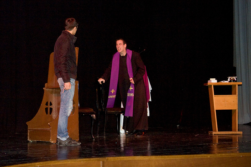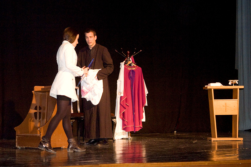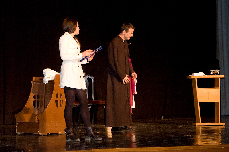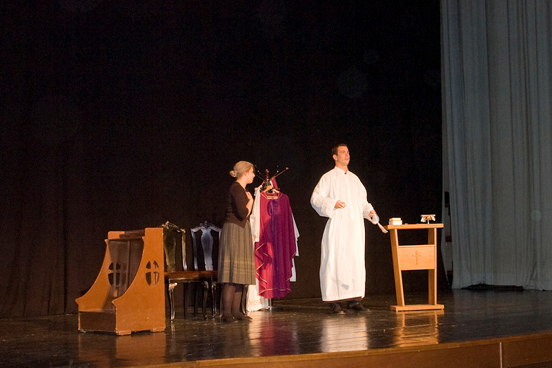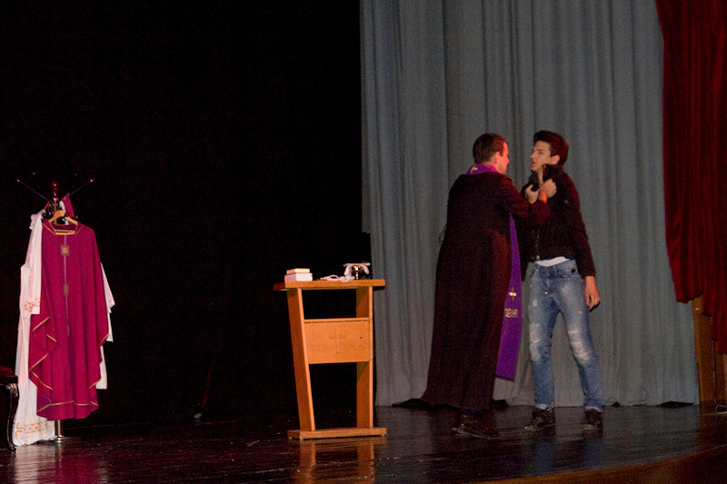 Metković, 5.4.2014. - Nakon što su prošle nedjelje u dvorani Pastoralnoga centra o. Ante Gabrića u Metkoviću premijerno odigrali predstavu Svećenik krvave haljine, glumci Kulturno-amaterskog kazališta Župe sv. Nikole iz Metkovića sinoć su je ponovno izveli pred potpuno ispunjenim gledalištem Gradskog kulturnog središta.