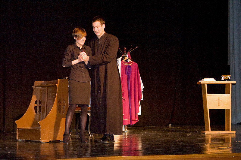 Predstava je nastala prema tekstu Raoula de Navéryja koji se temelji na istinitom događaju. Mladome svećeniku biva ubijen brat, čiji se ubojica baš njemu dolazi ispovjediti, provjeravajući prije toga hoće li čuvati ispovjednu tajnu. Teško breme koje je svećenik preuzeo na sebe postaje još teže kada sazna da se djevojka njegova ubijenoga brata namjerava udati za ubojicu svoga pokojnog zaručnika.