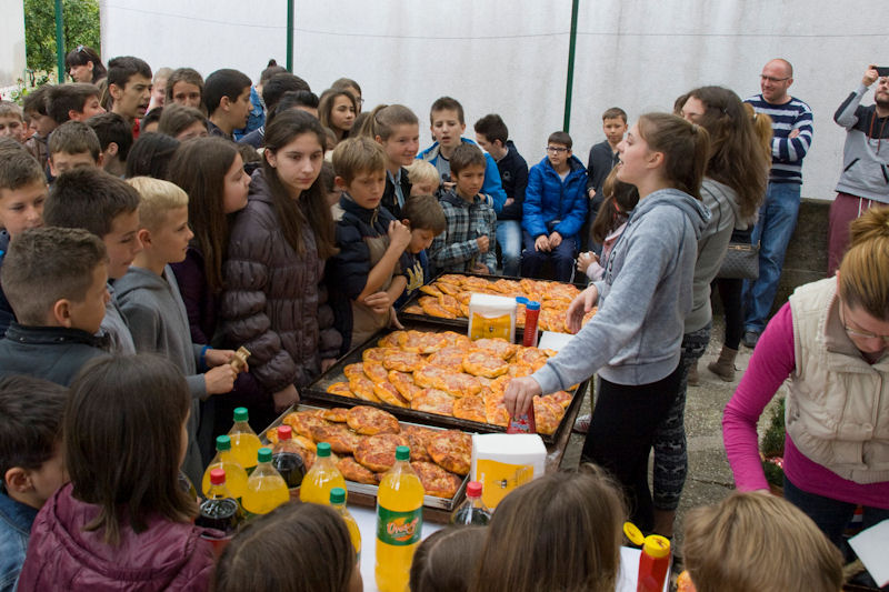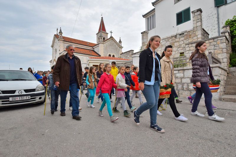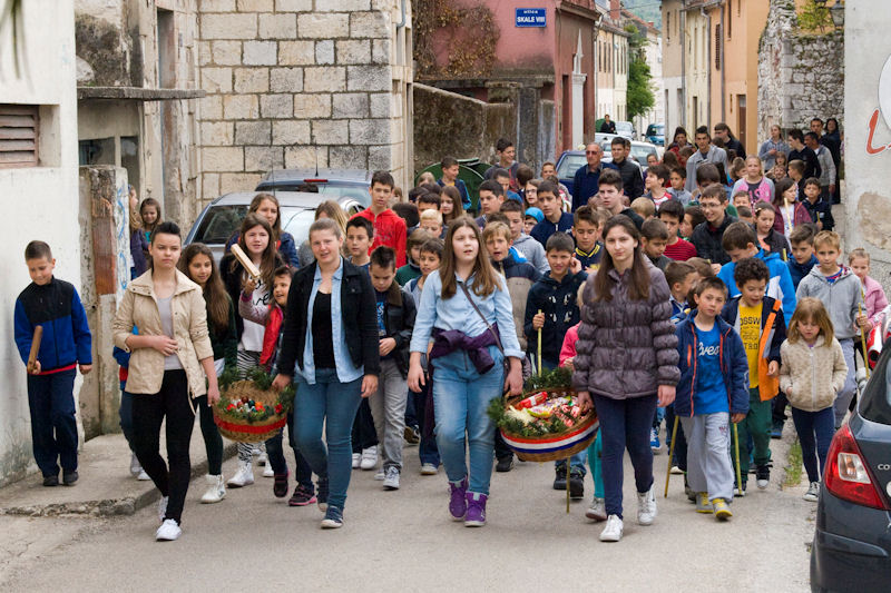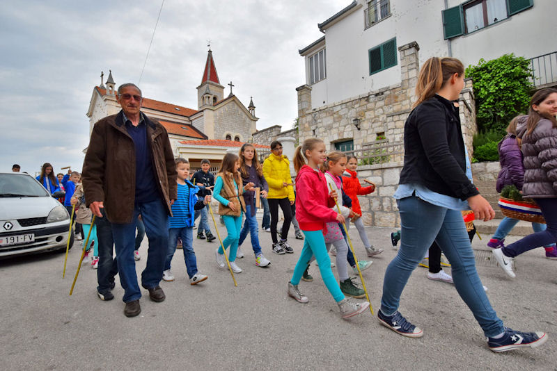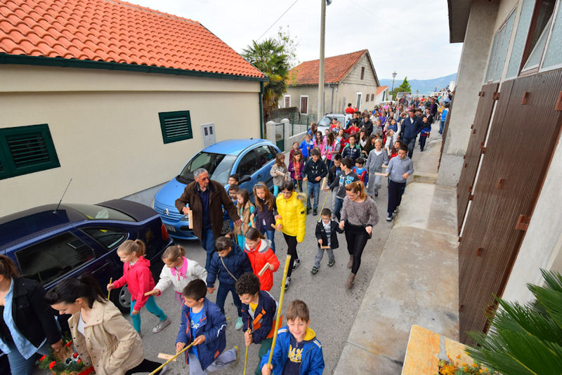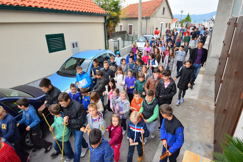 Metković, 19.4.2014. - Stvarajući buku svojim čevrtaljkama i štapovima, danas je oko 120 djece u deset sati krenulo od crkve sv. Ilije i starim se naseljem spustilo do središta grada. Iz godine u godinu običaj čevrtalja i barabana privlači sve više djece pod vodstvom Ferde Jakića, a već je tradicionalno postalo i to da na svome putu zastanu u dvorištu roditeljske kuće Brune Volarevića koji ih počasti picetom i sokom.