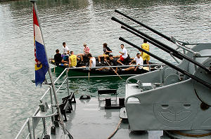 Metković, 12.8.2005. - Danas je u poslijepodnevnim satima Neretvom u Metković uplovio ophodni brod OB-64 "Hrvatska Kostajnica" koji će sutra na maratonu lađa biti u pratnji predsjedniku RH Stjepanu Mesiću na brodu "Palagruža". Prihvatili smo poziv na kavu zapovjednika broda poručnika fregate Ivana Tadića i saznali ponešto o brodu.