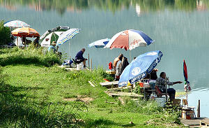 Metković, 12.9.2005. - Jučer je nakon subotnjeg nevremena osvanuo krasan dan pa su mnogi to iskoristili za nedjeljnu šetnju ili neku drugu aktivnost na zraku. Živo je bilo uz Neretvu gdje se okupljaju ribolovci čiji suncobrani stvaraju šarenu sliku na zelenoj rijeci.