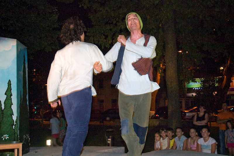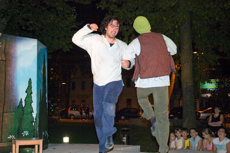 23.7.2014. - Potjeh, Ljutiša i baka te Svarožić i dva Bjesomara sinoć su u Gradskome parku u Metkoviću oduševili preko dvije stotine djece, od koje su mnoga došla u pratnji roditelja ili baka i djedova. Riječ je o adaptaciji poznate priče iz davnine Kako je Potjeh tražio istinu koju su u kazališnoj predstavi uprizorili glumci Kazališta Merlin iz Zagreba.