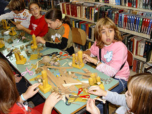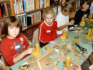 29.10.2005. - I ove subote je u Gradskoj knjižnici organizirana radionica za male članove knjižnice. Pod vodstvom gđe Ljiljane Kraljević djeca su izrađivala ukrasne svijeća od prirodnih materijala. Koristili su pčelinji vosak, pluto, špag, kukuruzovinu te različite plodove šumskih biljaka.