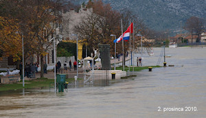 Metković, 5.12.2014. - Noćas je Neretva bila dosegla 180 cm (pretprošle noći 200 cm), ali je u 10 sati pala na ispod 140 cm. Stanje nije zabrinjavajuće, a slijedi nam i razdoblje ljepšega vremena. Uostalom, i nasip je oko Metkovića već dosegao respektabilnu visinu.