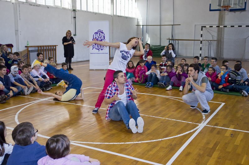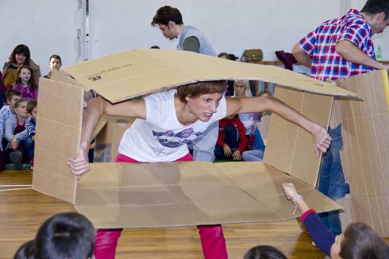 Spomenuta predstava je interaktivno-plesni program koji su osmislile Larisa Navojec i Tamara Curić, a uz njih predstavu izvode glumci Zoran Pribičević i Petar Cvirn. Koristeći okvir poznate dječje priče o tri praščića, predstava govori o kreativnosti, zajedništvu, lijenosti, nespretnosti, prijateljstvu. Zanimljiva predstava razveselila je prisutne školarce, a prema onome što se nakon nje moglo vidjeti na radionici potaknula ih je na izražavanje svojih sposobnosti, ali na drugačiji način od onoga uobičajenoga.