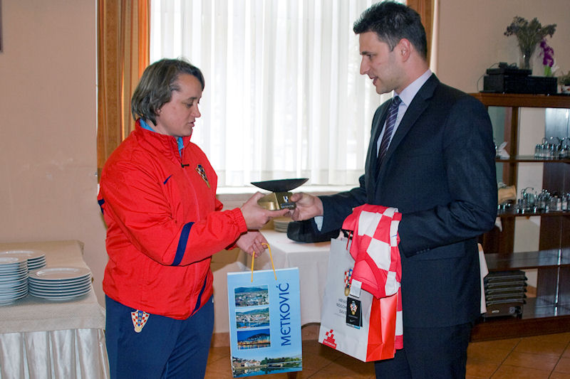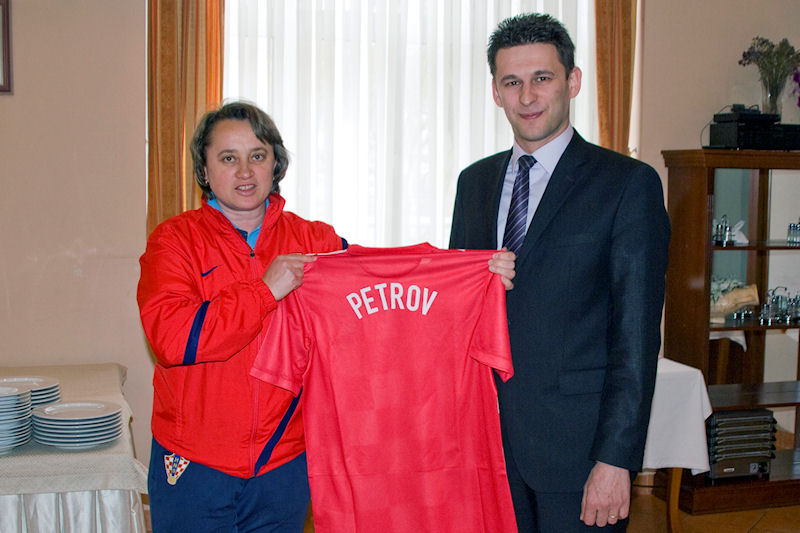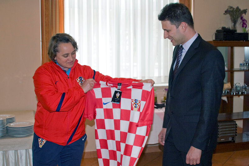 Izbornica Damjanović Petrova je predstavila djevojkama rekavši im da su došle u sportski bogat grad i zahvalila mu na podršci koju je Grad Metković pružio boravku reprezentacije. Pozdravivši ih, Petrov je izrazio zadovoljstvo što je jedna hrvatska nogometna selekcija za pripreme izabrala Metković te najavio da će gradnjom Sportskoga centara Metković dobiti kudikamo bolje uvjete za održavanje priprema sportaša. Prije zajedničkoga fotografiranja, Damjanović i Petrov razmijenili su prigodne darove.