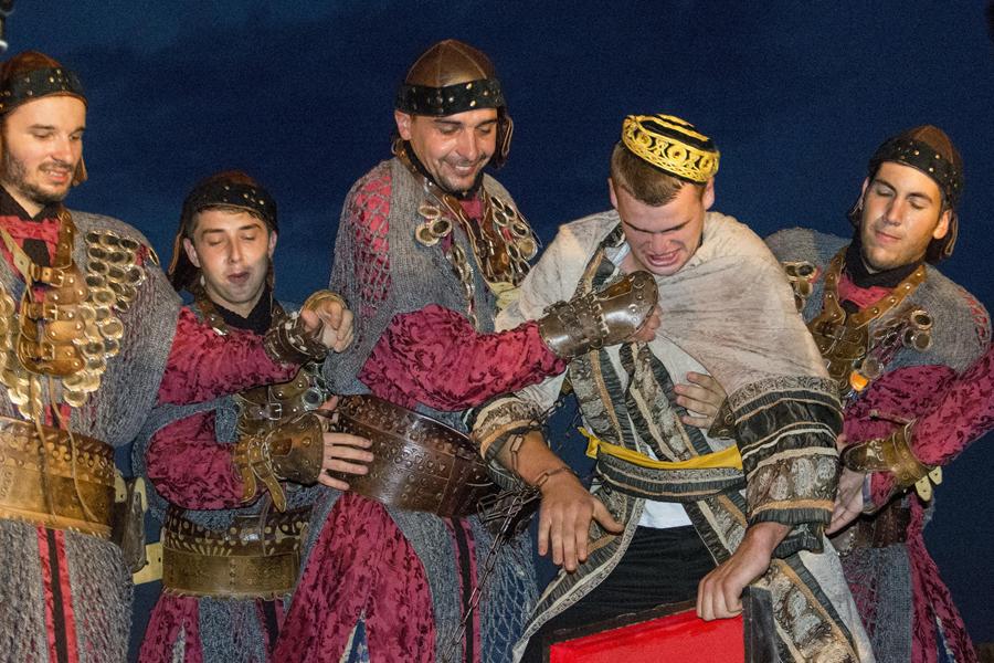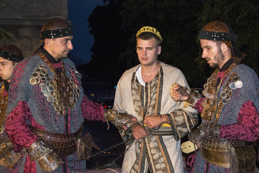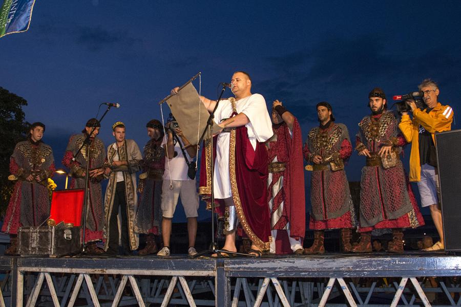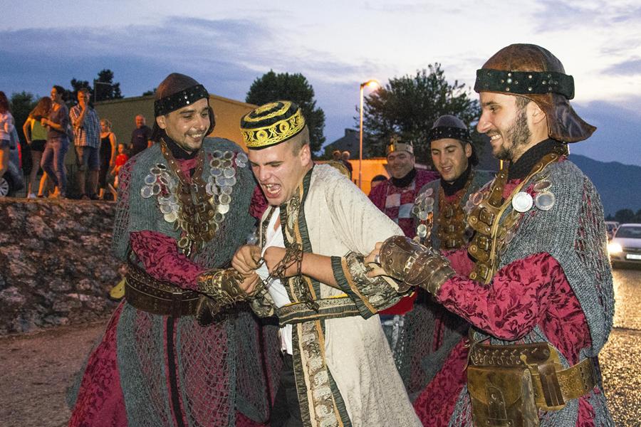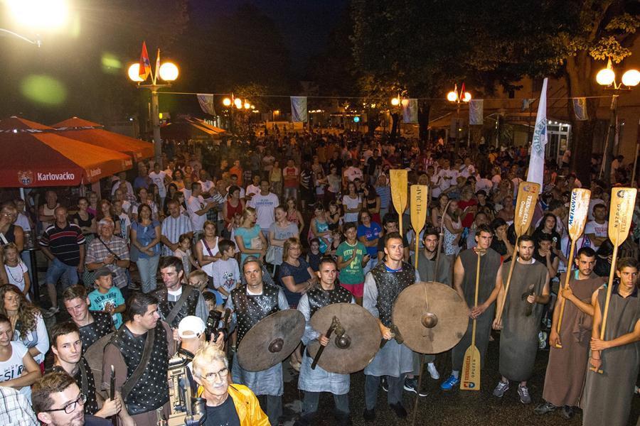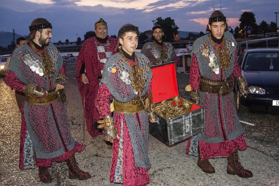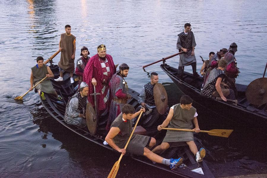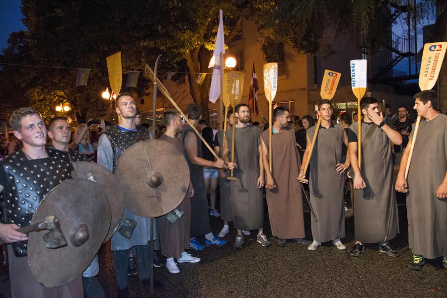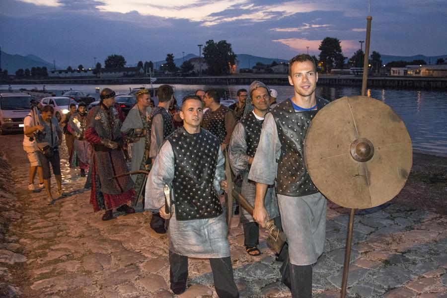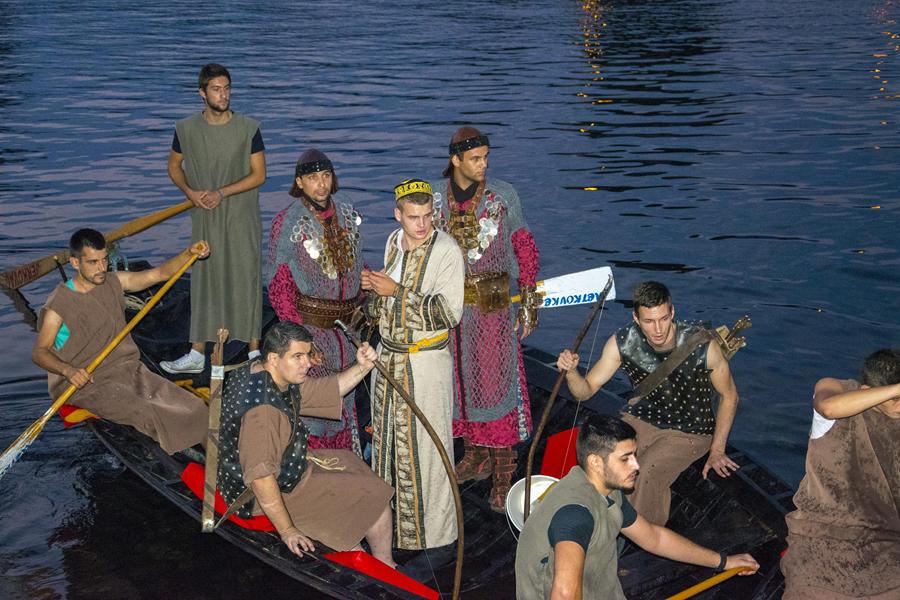 Metković, 7.8.2015. - Gusarskim iskrcavanjem na Maloj rivi sinoć je započela manifestacija II. Dani Neretvanske kneževine koja će trajati još danas i sutra. Neretvanski gusari doplovili su Neretvom na svojim lađama i uz plijen doveli zarobljenoga dužda. Nakon što su na Trgu kralja Tomislava opjevali svoje podvige i izrugivali se duždu, zatvorili su ga u kavez čekajući otkupninu.