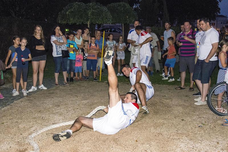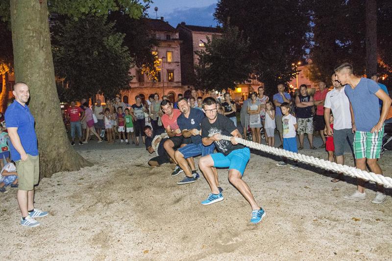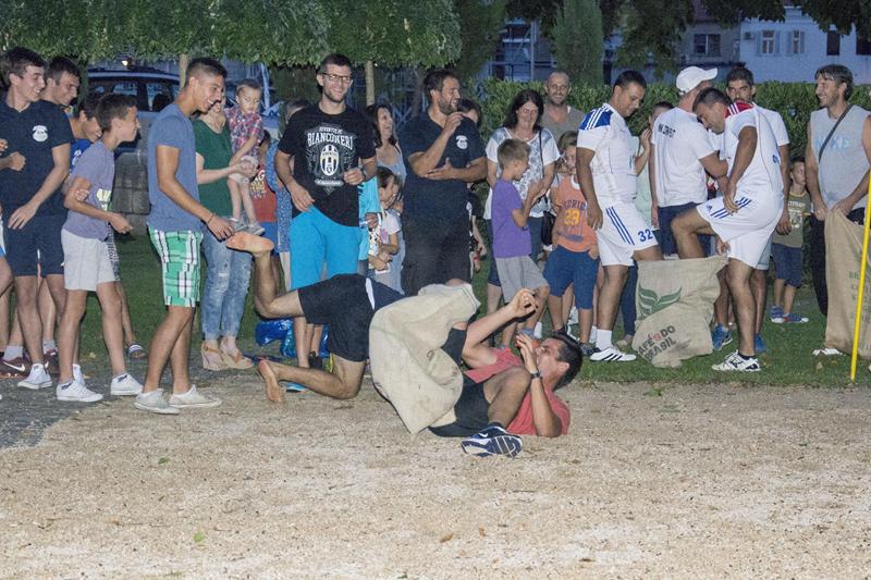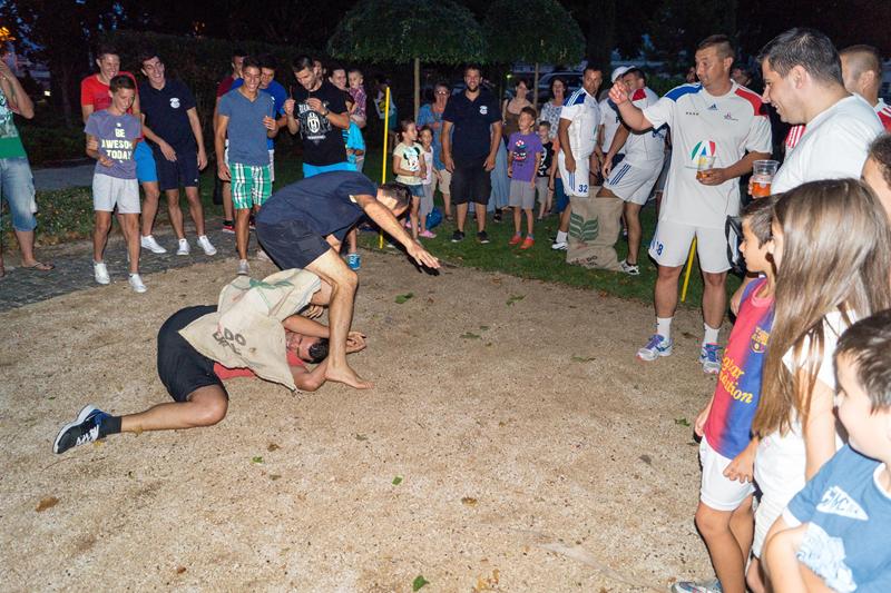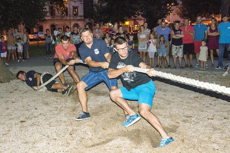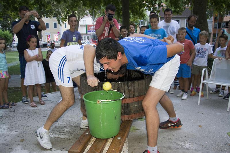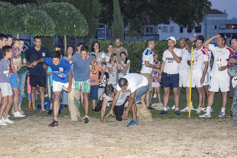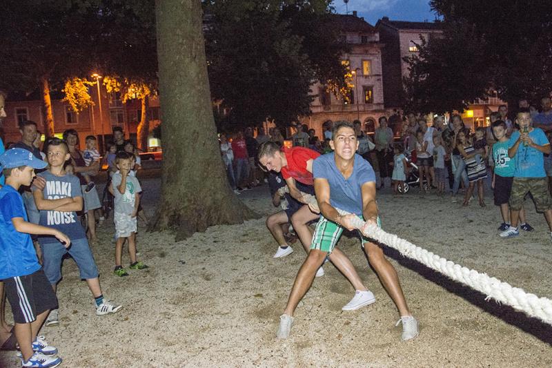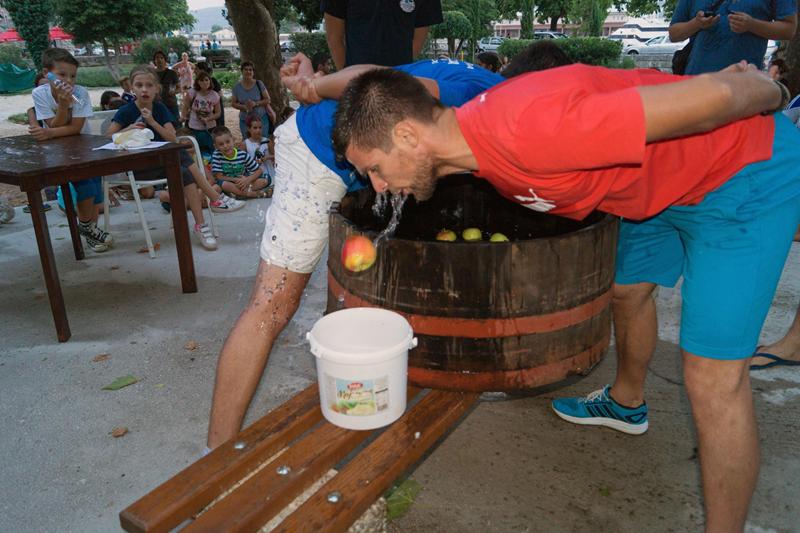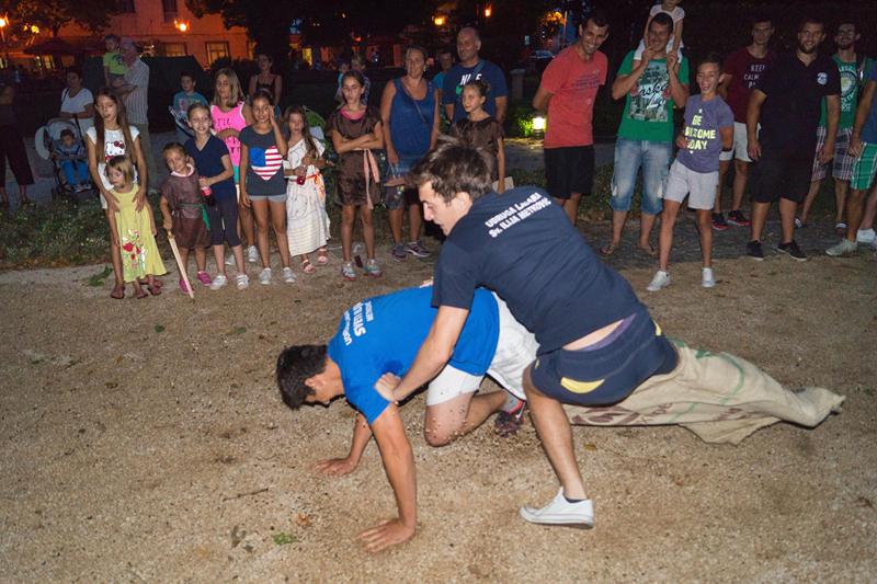 Metković, 8.8.2015. - Jučer je kiša omela održavanje viteških igara za djecu u Gradskome parku, ali su predvečer održane igre za odrasle, koji su se natjecali i vađenju jabuka iz maštela, obaranju ruke, bacanju potkove, trčanju u vrećama i potezanju konopa.