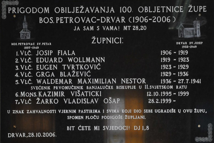 Župa Drvar osnovana je 1906. godine i obuhvaćala je područje Drvara, a 1932. godine sagrađena je crkva sv. Josipa i župna kuća koje su srušene nakon II. svjetskog rata. Jedan od mnogih događaja o kojima se pola stoljeća moralo šutjeti zbio se 27. srpnja 1941. U tzv. ustanku (taj se nadnevak u SR Hrvatskoj slavio kao Dan ustanka) „ustanici“ su presreli vlak u kojemu su bili hodočasnici iz Drvara, na čelu sa župnikom Waldemarom Maksimilijanom Nestorom, na povratku s hodočašća sv. Ani u Kosovu kraj Knina. Putnike katolike izveli su iz vlaka, svezali ih i odveli u mjesto Trubar blizu Drvara te ih sve sa župnikom pobili i bacili u jamu Golubnjaču. Bogoslužje se danas održava u nekadašnjemu Društvenom domu Partizan jer mjesne vlasti opstruiraju dodjelu zemljišta za gradnju nove župne crkve. Danas u Drvaru živi petstotinjak Hrvata, uglavnom doseljenih iz srednje Bosne.