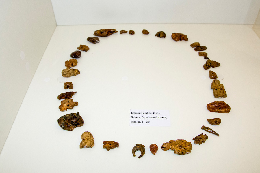 Izloženi su predmeti od jantara kao što su životinjske figurice, prstenje, ukosnice, privjesci i ogrlice koji su pronađeni u Saloni i datiraju iz razdoblja prvoga i drugoga stoljeća poslije Krista.