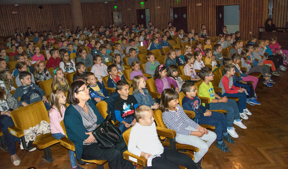 13.10.2015. - Glumci mlađe skupine Amaterskoga kazališta Opuzen danas su učenicima nižih razreda OP don Mihovil Pavlinović u kazališnoj dvorani GKS-a odigrali predstavu Mala zelena gusjenica Nives Madunić Barišić.