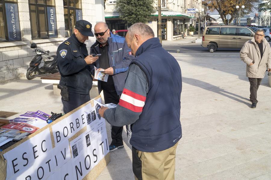 14.12.2015. - Danas su na Trgu kralja Tomislava policijski službenici iz PP Metković postavili info-pult povodom Mjeseca borbe protiv ovisnosti te građanima dijele prikladne tiskane materijale. Osim toga, građani se mogu testirati na alkohol i pogledati kroz tzv. pijane naočale koje simuliraju vid vozača pod utjecajem alkohola. Akcija traje do 13 sati.