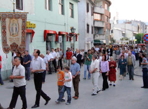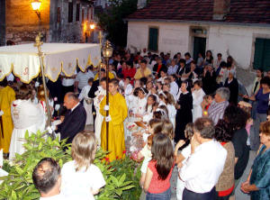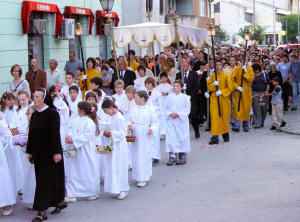 Metković, 16.6.2006. - Kao i svake godine na prvi četvrtak poslije blagdana Svetog Trojstva, kada se slavi blagdan Tijelova, poslije mise u crkvi Sv. Ilije kreće procesija starom dijelom Metkovića. Na putu kojim se kreće uređuju se oltari uz koje se vjernička kolona na kratko uz molitvu zaustavi.