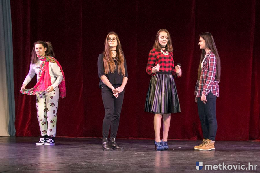 Za skupni scenski nastup E. Ionesco: Ćelava pjevačica (ulomak), nagrađeni su učenici 3. r. Gimnazije Metković Božidar Bartulović, Karla Bebići Matej Mustapić, mentorica Ivanka Ujdur.