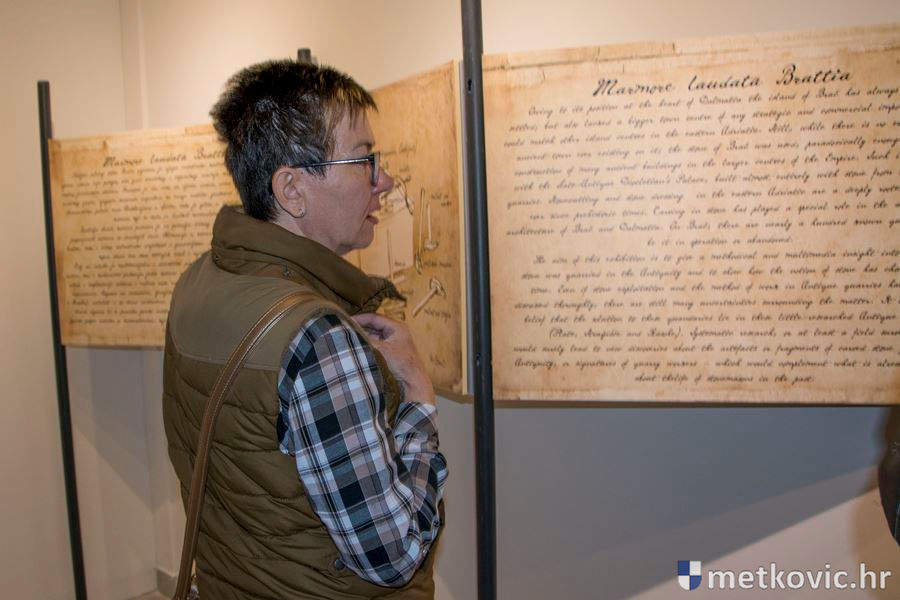 Zaželjevši okupljenima dobrodošlicu, izložbu su otvorili ravnatelj Muzeja Toni Glučina, metkovska gradonačelnica Katarina Ujdur i sam autor. Uz izložbu, koja je zamišljena kao edukativna pa donosi prikaz bračkih kamenoloma, alata, tehnika vađenja i obrade kamena, prikazana su i dva kratka filma. Prvi je animirani film Od kamenoloma do palače, koji prikazuje sve faze vađenja kamena u jednom od bračkih kamenoloma, transport do broda, lučku infrastrukturu, izgled broda, plovidbu i iskrcavanje te ugradnju kamena. Drugi je dokumentarac Hop Jan iz 1967., djelo našega Neretvanina Vlatka Filipovića, kojim je prikazana sva muka vađenja kamenih blokova iz pučiškoga kamenoloma na otoku Braču. Izložba je popraćena i crtežima na kojima je dočaran rad u kamenolomu te gipsanom maketom koja prikazuje organizaciju posla oko transporta kamenih bokova u antičkoj luci.