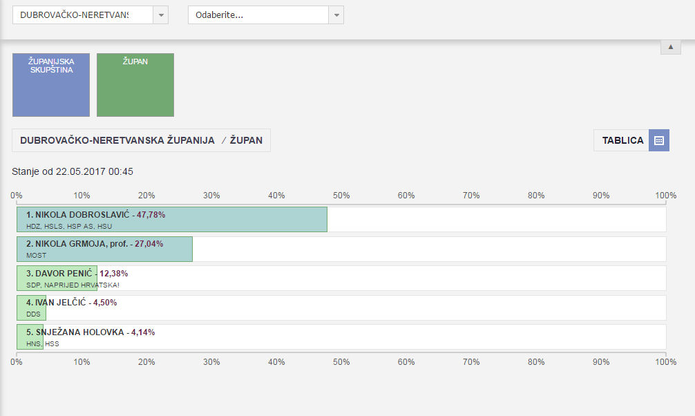 Metković, 22.5.2017. - Gotova je bitka za Županiju tj. prvi krug za župana. HDZ je s partnerima dosegao gotovo 45 %, dok je Most s desetak posto iz 2013. skočio preko 25 %. Nikola Dobroslavić je u prvi mah skoro imao pobjedu, ali na kraju je stao na 47,78 %. S njim u drugi krug ide Nikola Grmoja koji je osvojio 27,04 %.
