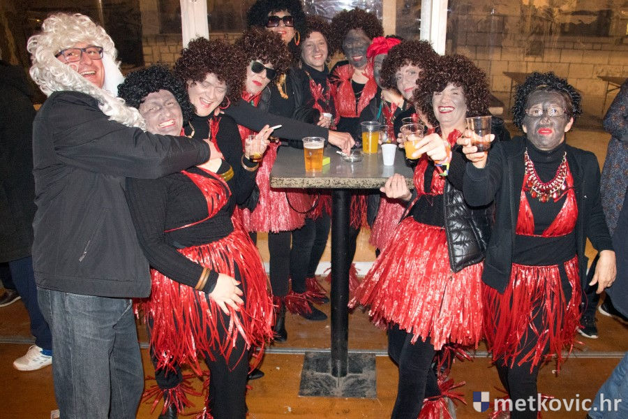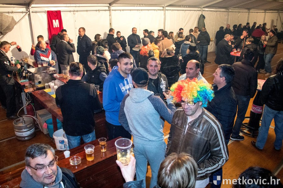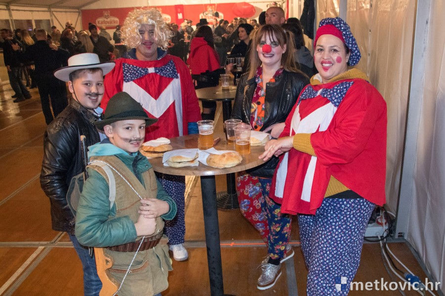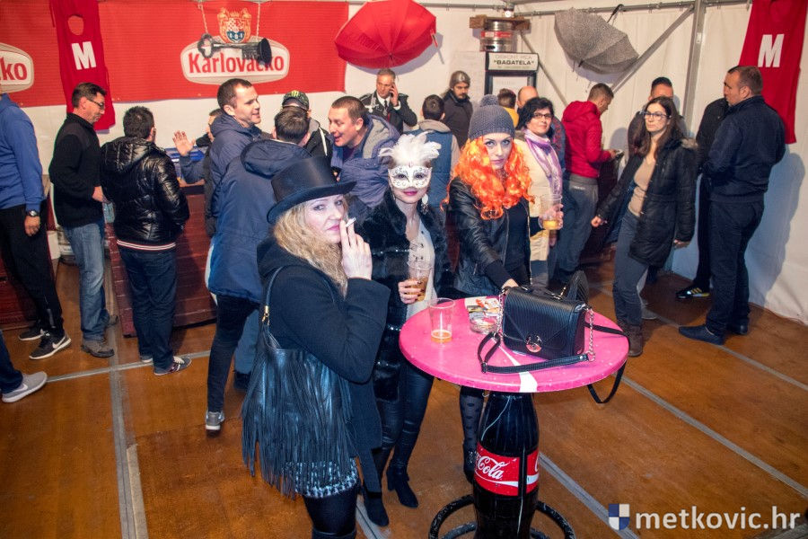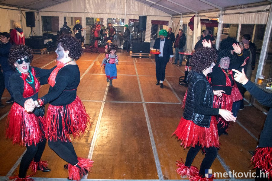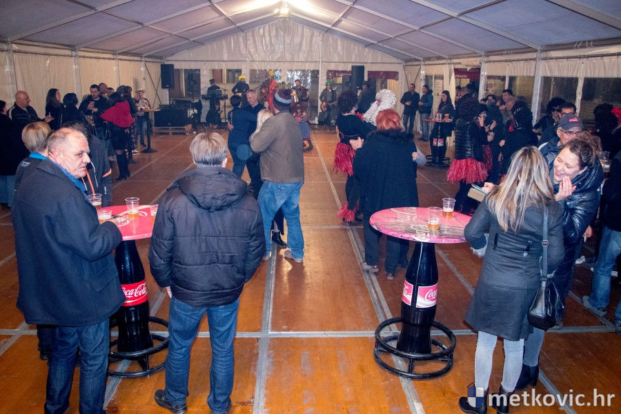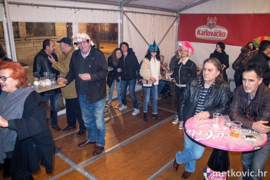 5.2.2018. - Pod pokladnim je šatorom sinoć održana prva u nizu zabava za maškarane i one koji još nisu odlučili u što će se maškarati. Atmosferu je grijala domaća Grupa Versi, a za nadoknadu u plesu potrošenih kalorija pobrinuo se Ivica Boras Kiko, koji je skuhao veliku teću junećega gulaša s njokama.
